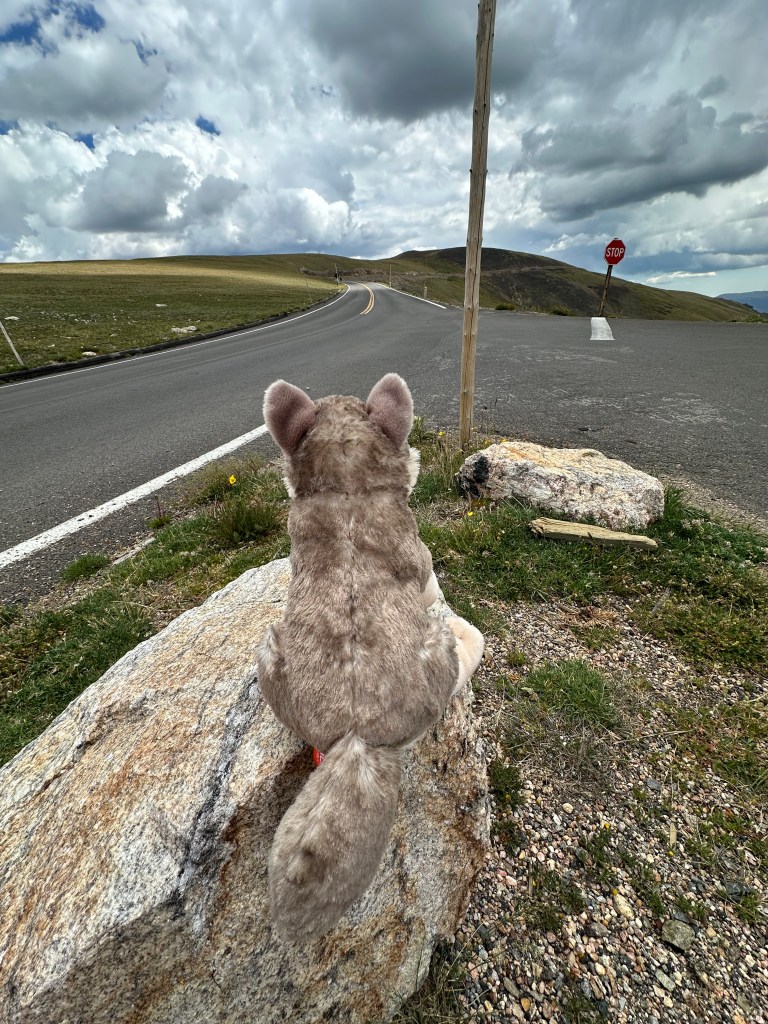 You are now on the Mount Blue Sky Scenic Byway, riding toward the top of Mount Blue Sky. The road takes us within 135 vertical feet of the summit. The parking lot is that close to the summit.