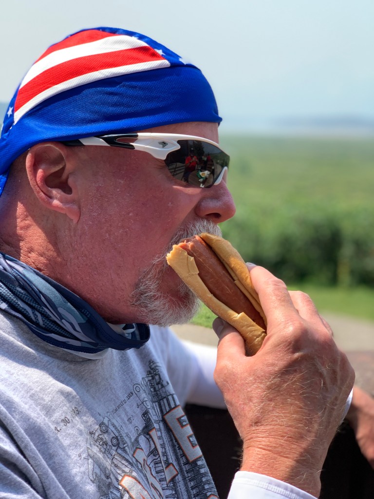 Meanwhile, John polishes off his last hot dog of the trip — in Seligman, Arizona.