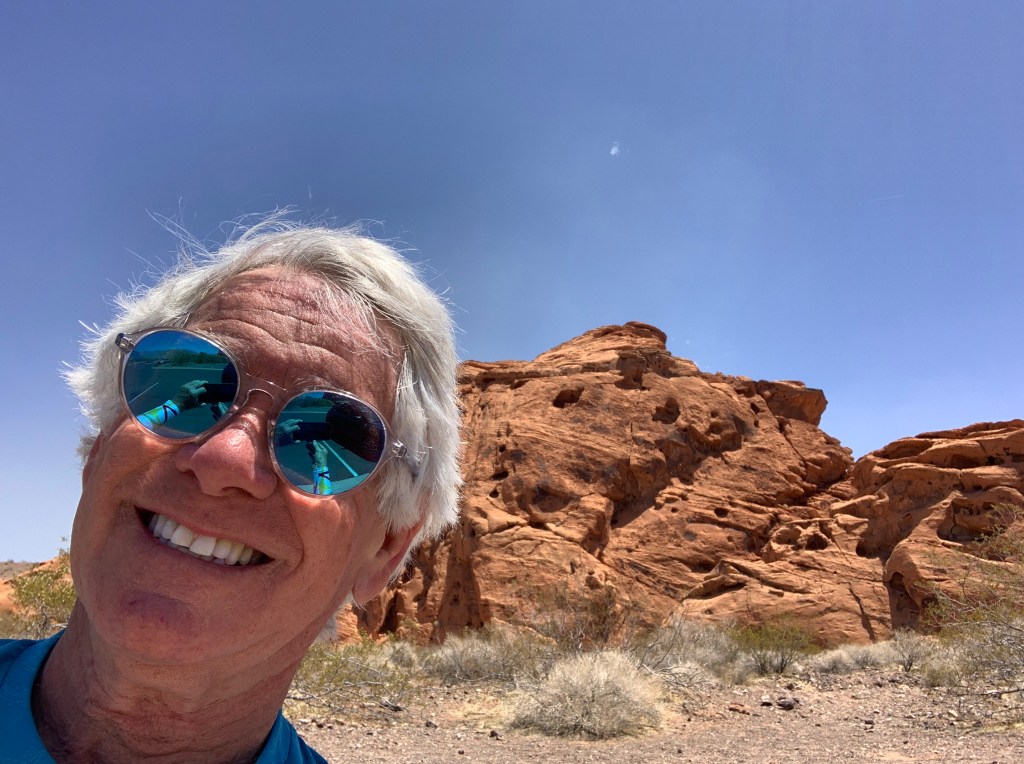 At Redstone, a rest stop in the Valley of Fire, I grab a selfie in front of a popular photo rock. It’s 94 degrees.