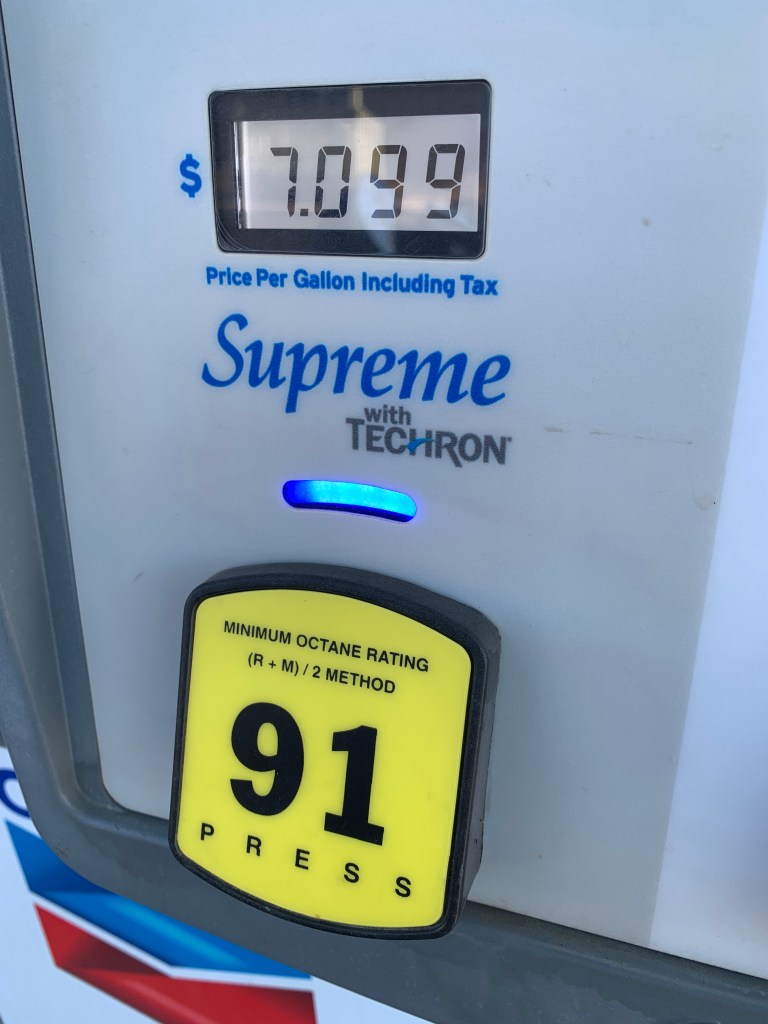 We’re in California, where gas prices border on ridiculous. Um, actually, they’ve long crossed the ridiculous threshold. Gas today is closer to $7 per gallon than $6. Yes, it’s premium, and my tank only holds six gallons, but still. The possibility of a $40 fill-up on a motorcycle is crazy.